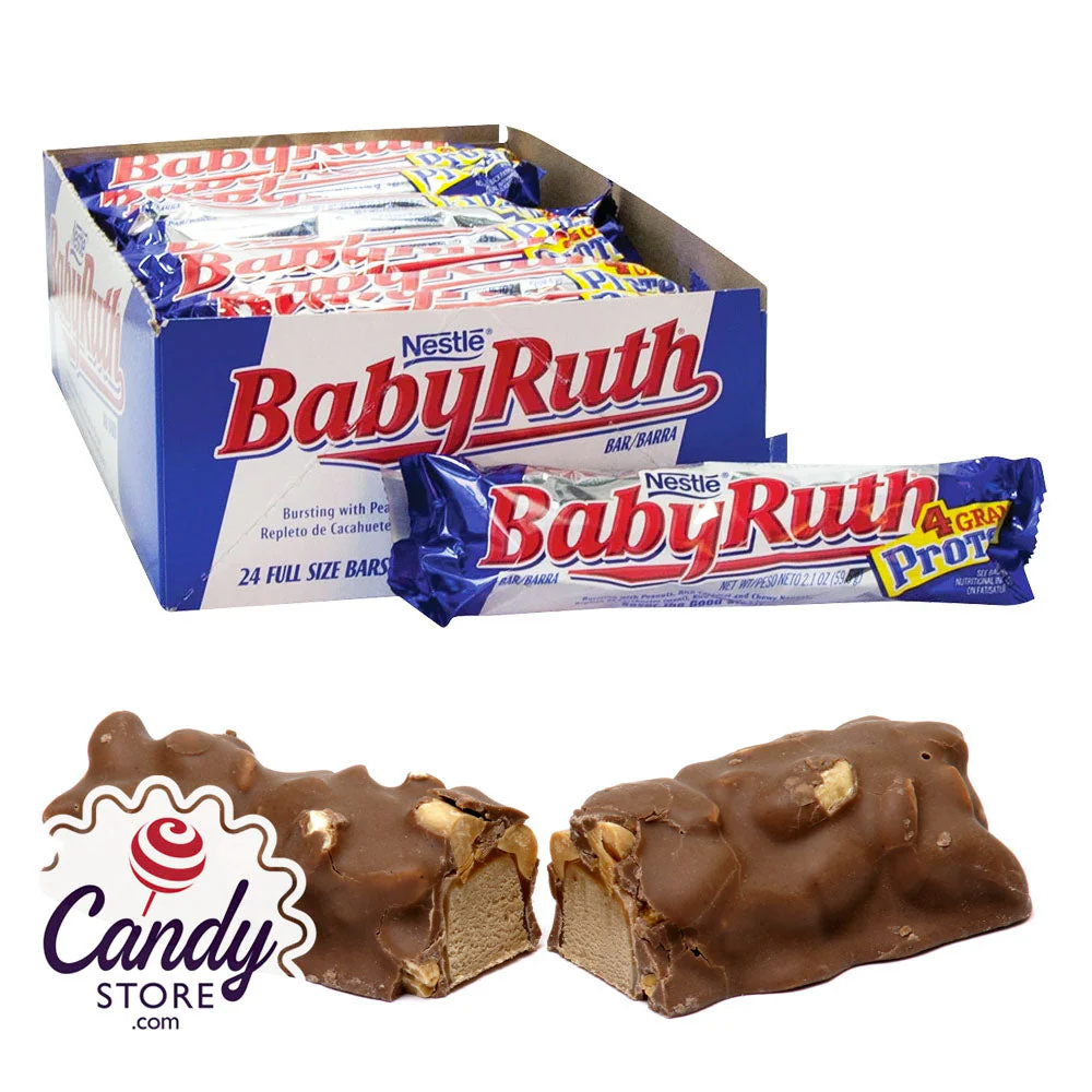 Baby Ruth Bars deliver decades of candy bar satisfaction in this convenient 24-count box. Each milk chocolate bar is loaded with peanuts, chewy nougat, and rich caramel for the classic taste fans have loved for generations.
