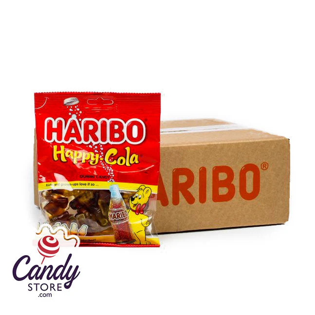Haribo Happy Cola Bottles Gummi Candy comes in convenient 5oz peg bags, with 12 bags per case for a total of 60oz of cola-flavored gummies. These iconic bottle-shaped candies capture the bubbly taste of real cola in chewy gummi form.